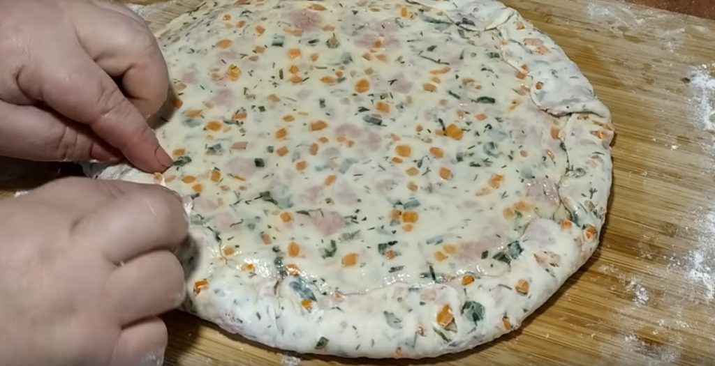 Împăturim cu tarta mare cele mici, îndoind marginile turtei mari spre interior.