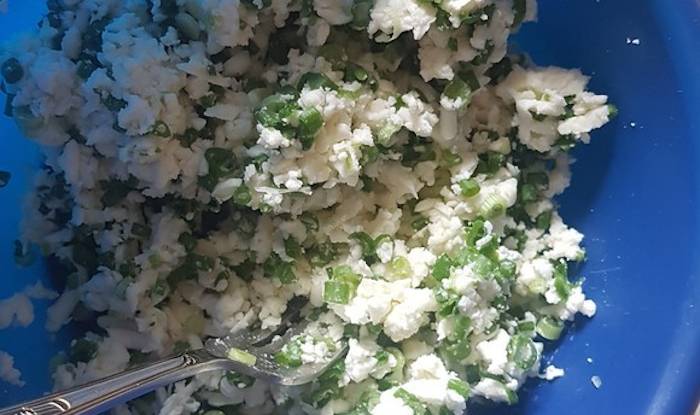 Pentru a prepara umplutura, dam branza feta printr-o razatoare grosiera. Tocam apoi o legatura de ceapa verde si o amestecam cu branza feta.Transferam aluatul pe blatul de lucru presarat cu faina si-l taiem in mai multe parti egale. Rulam fiecare bucata de aluat sub forma unei turte. Punem o lingura de umplutura in centru.