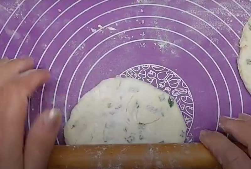 Împărțiți aluatul în 10 bucăți egale. Întindeți bilele în foi de aproximativ 1 cm grosime. Puneți o lingură de umplutură în fiecare turta, sigilați în interior.