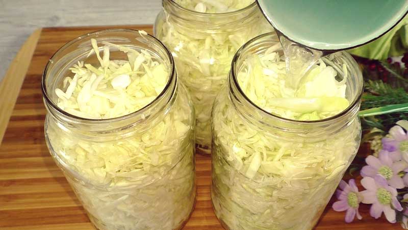 Pur și simplu spăl borcanele pentru această rețetă cu bicarbonat de sodiu și le usuc la cuptor, iar peste capace torn apă clocotită. Este mai bine să folosiți borcane de nu mai mult de 1 litru, deoarece după deschiderea unui astfel de preparat, varza trebuie folosită imediat.