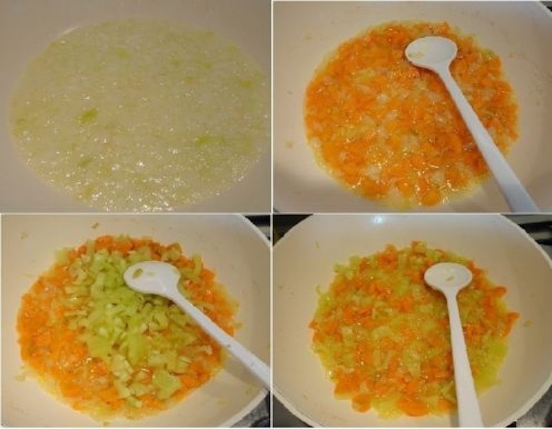 Intre timp, pregatim umplutura. Curatam ceapa si o taiem in cubulete mici. Prajim ceapa in ulei. Adaugam morcovii curatati si taiati marunt. Prajim putin legumele, apoi adaugam ardeii grasi tocati marunt. Mai prajim legumele timp de cateva minute.