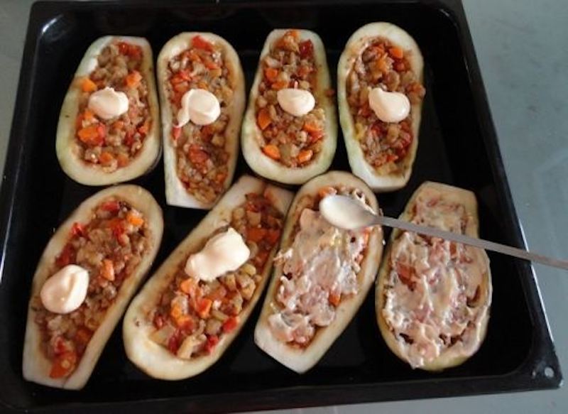Punem vinetele intr-o tava mare. Le ungem cu ulei, le presaram cu putina sare si le umplem cu amestecul de legume. Intindem apoi un strat subtire de maioneza deasupra.